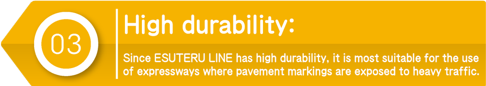 ESUTERU LINE exhibits superior performance especially on expressways, where road markings must be durable against the vehicle impact. ESUTERU LINE is expected to last 5 years, while existing lines need to be repainted in 2-3 years. Although ESUTERU LINE costs 1.5 times greater than conventional ones, its high durability can help reduce the frequency of marking installation work. This will eventually lead to reduce traffic congestion and accidents due to traffic restriction during the installation.”