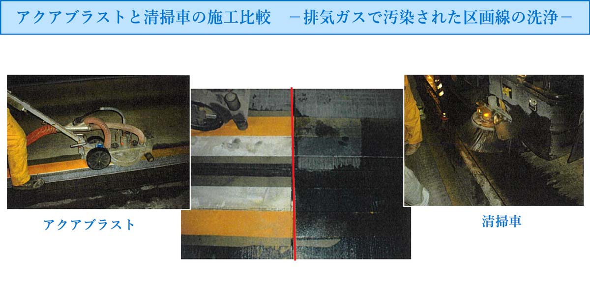 このメンテナンス作業では、アクアブラストと清掃車を使用し、汚れたセンターラインを洗浄。