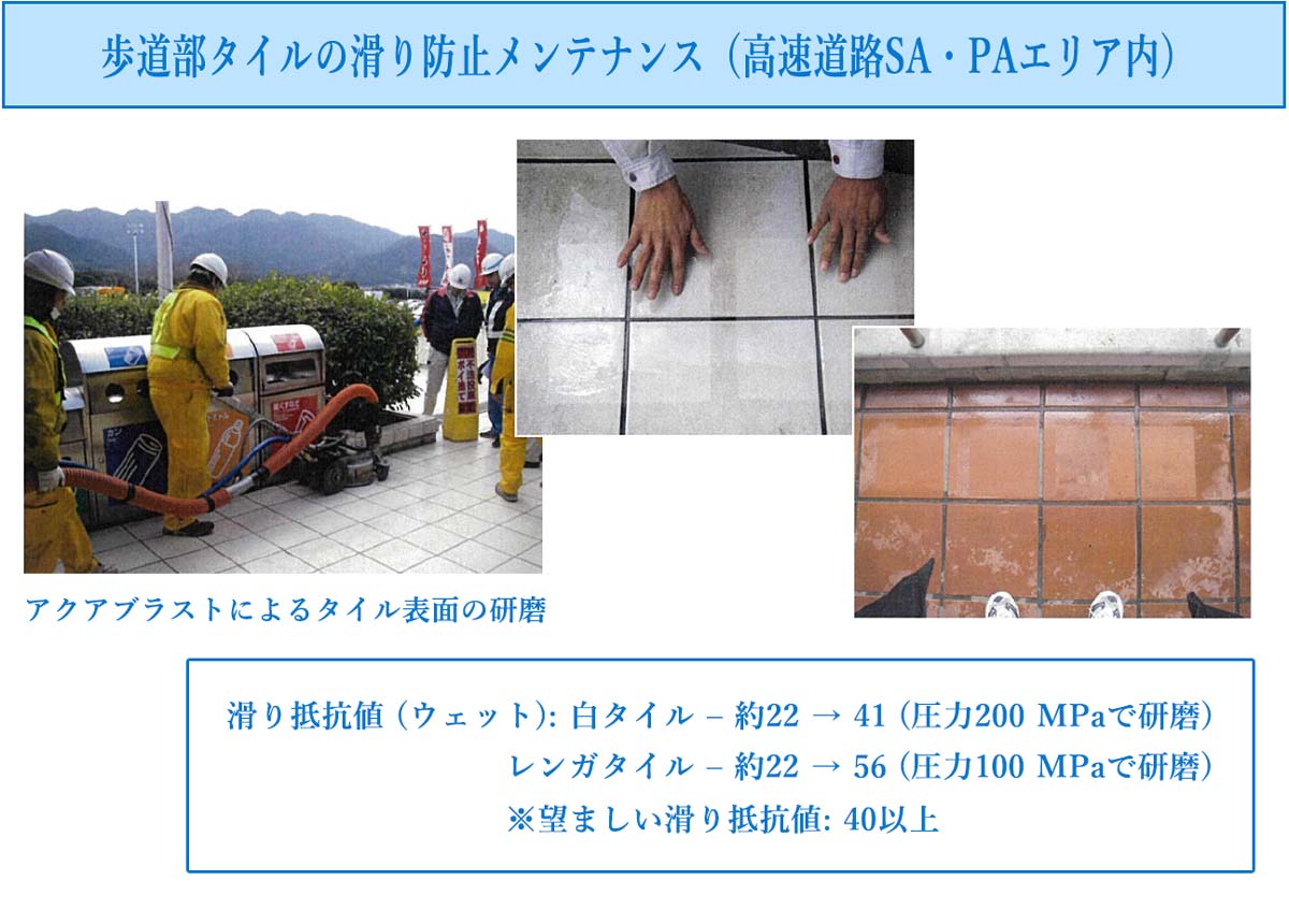 アクアブラストを使用し、SA・PAエリア内の歩道部タイルの表面処理を実施。