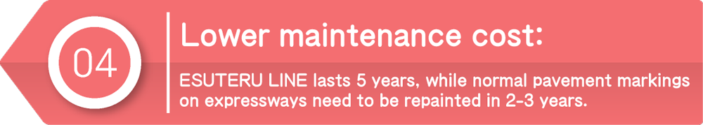 ESUTERU LINE exhibits superior performance especially on expressways, where road markings must be durable against the vehicle impact. ESUTERU LINE is expected to last 5 years, while existing lines need to be repainted in 2-3 years. Although ESUTERU LINE costs 1.5 times greater than conventional ones, its high durability can help reduce the frequency of marking installation work. This will eventually lead to reduce traffic congestion and accidents due to traffic restriction during the installation.”