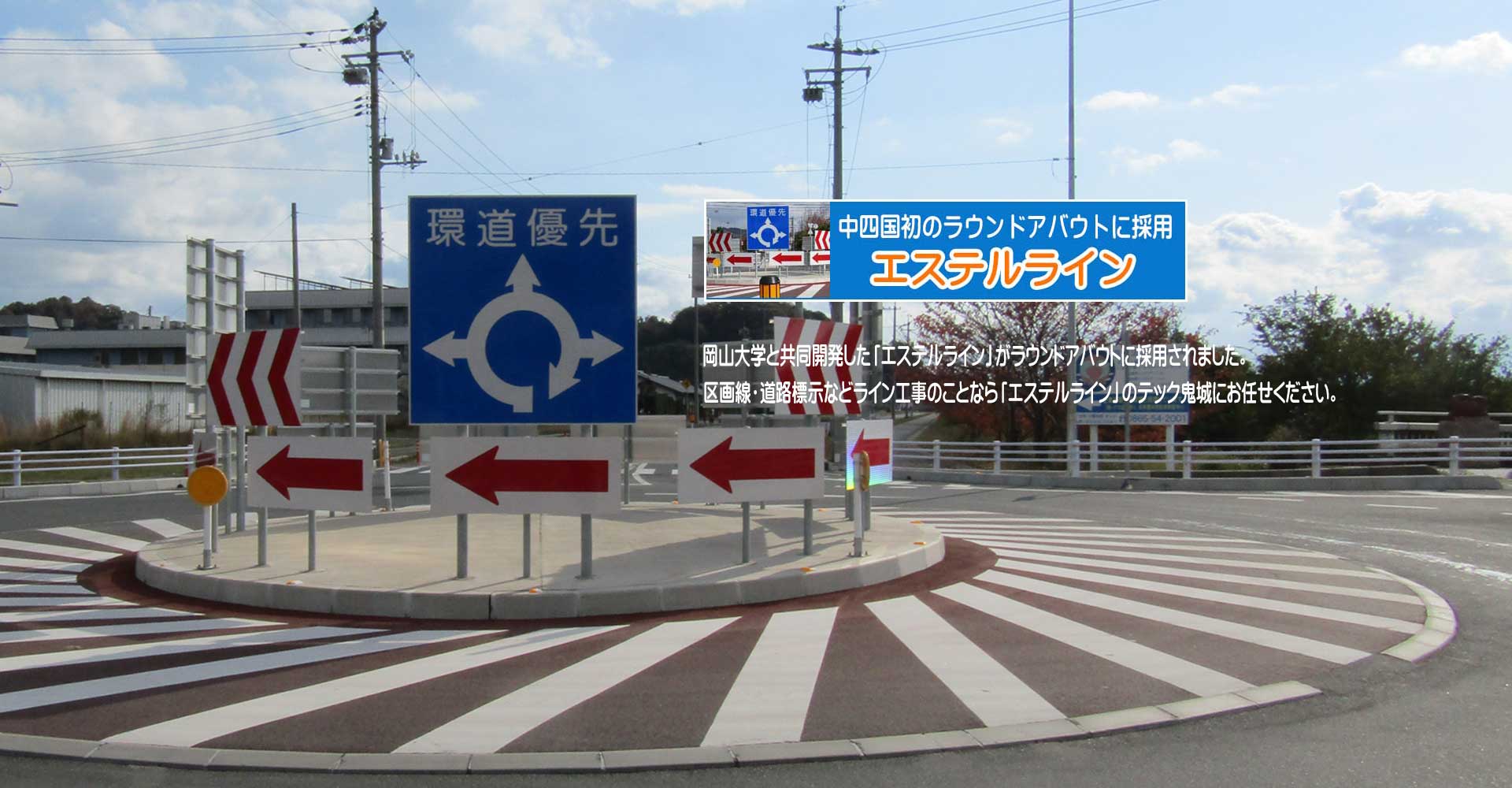 中四国で初めてとなる信号機の無い環状交差点「ラウンドアバウト」のライン工事をエステルラインを利用してテック鬼城が施工しました。